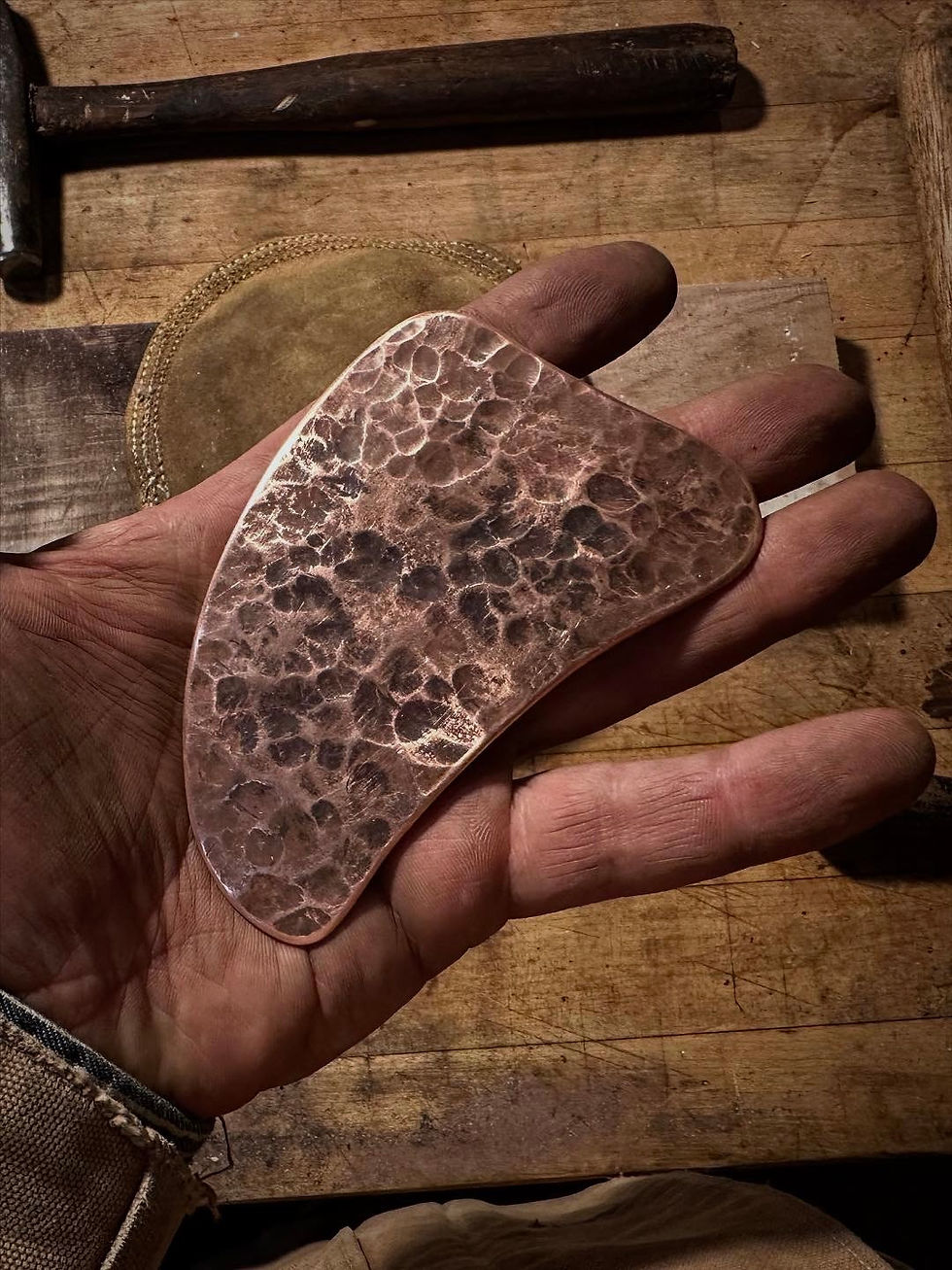 The result has been exceptional. Though I have crafted several templates, each piece is unique. They are adorned with hammered texture through the forging process that is both radiates beauty and feels timeless. In the hand, the copper is resonant and welcome. I have spent a great deal of time working on shapes that fit into the palm like an extension of the body. Each has several working services for the dynamic typography of the body.